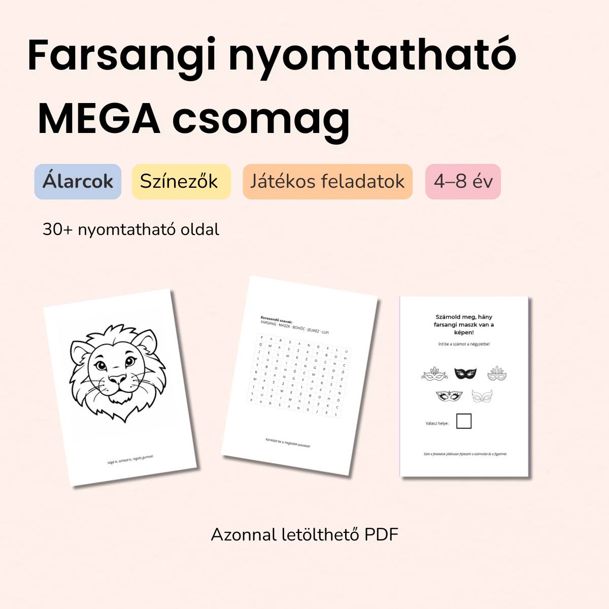 Azonnal letölthető, nyomtatható farsangi játékcsomag 4–8 éves gyerekeknek.